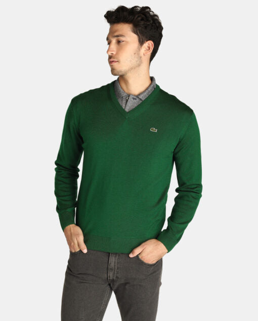 Lacoste Reader hecho de algodón mixto. Cocodrilo bordado en el cofre. Collar con V. Mangas largas. Terminado con costas en el cuello, las muñecas y el fondo. Color verde. Ajuste regular